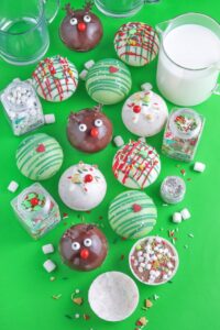These Christmas Tree Hot Cocoa Bombs are cute, fun and super festive: little green chocolate trees filled with hot cocoa mix and mini marshmallows. When you pour hot milk over them, they melt, pop open and turn into a cozy cup of hot chocolate.